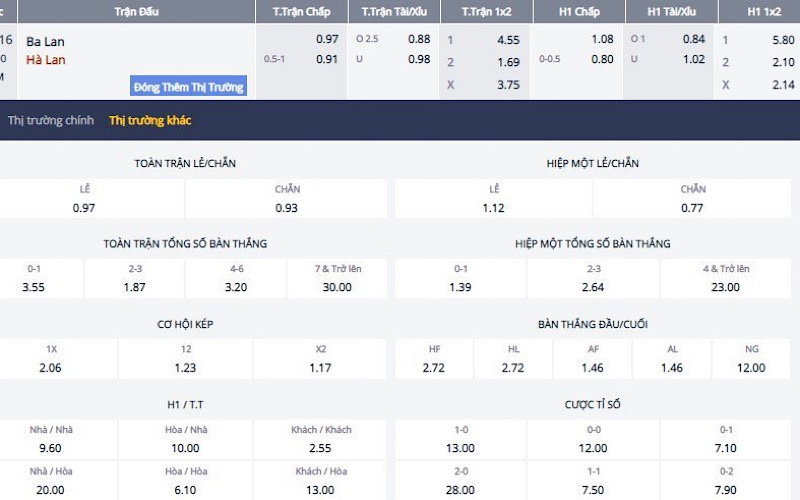 Tỷ lệ kèo Ba Lan vs Hà Lan